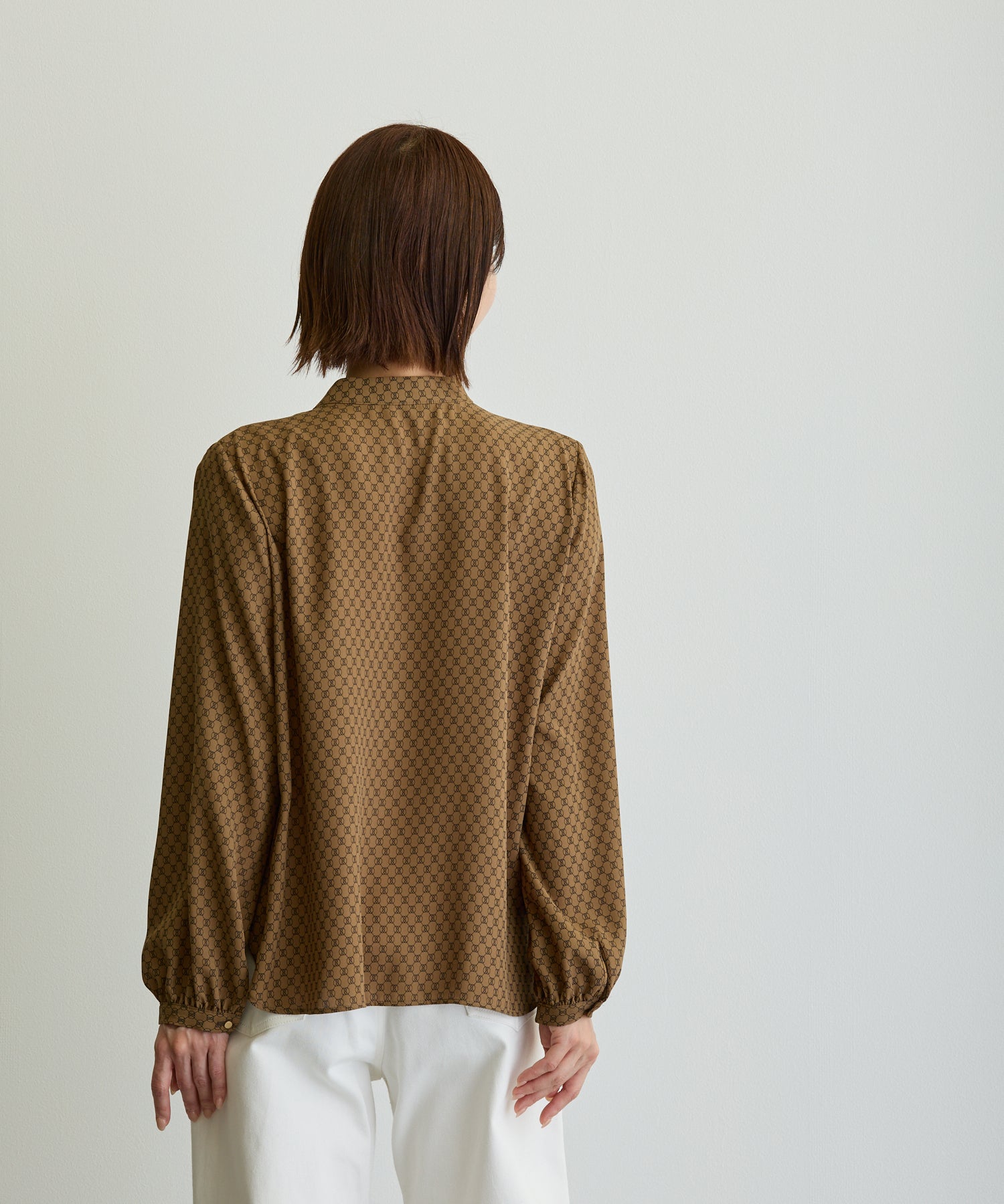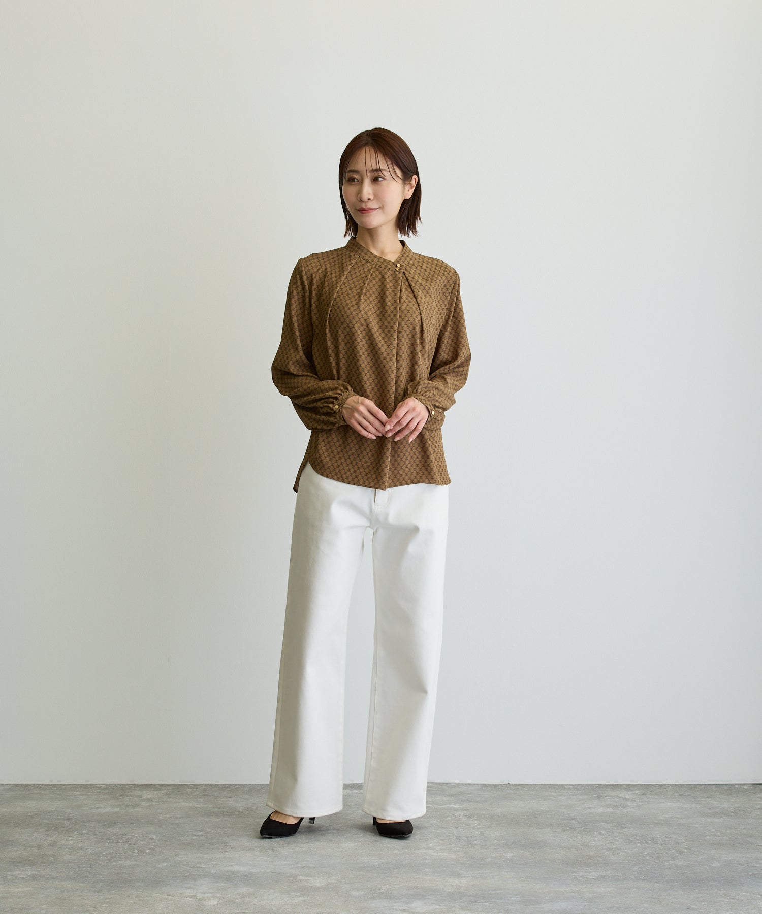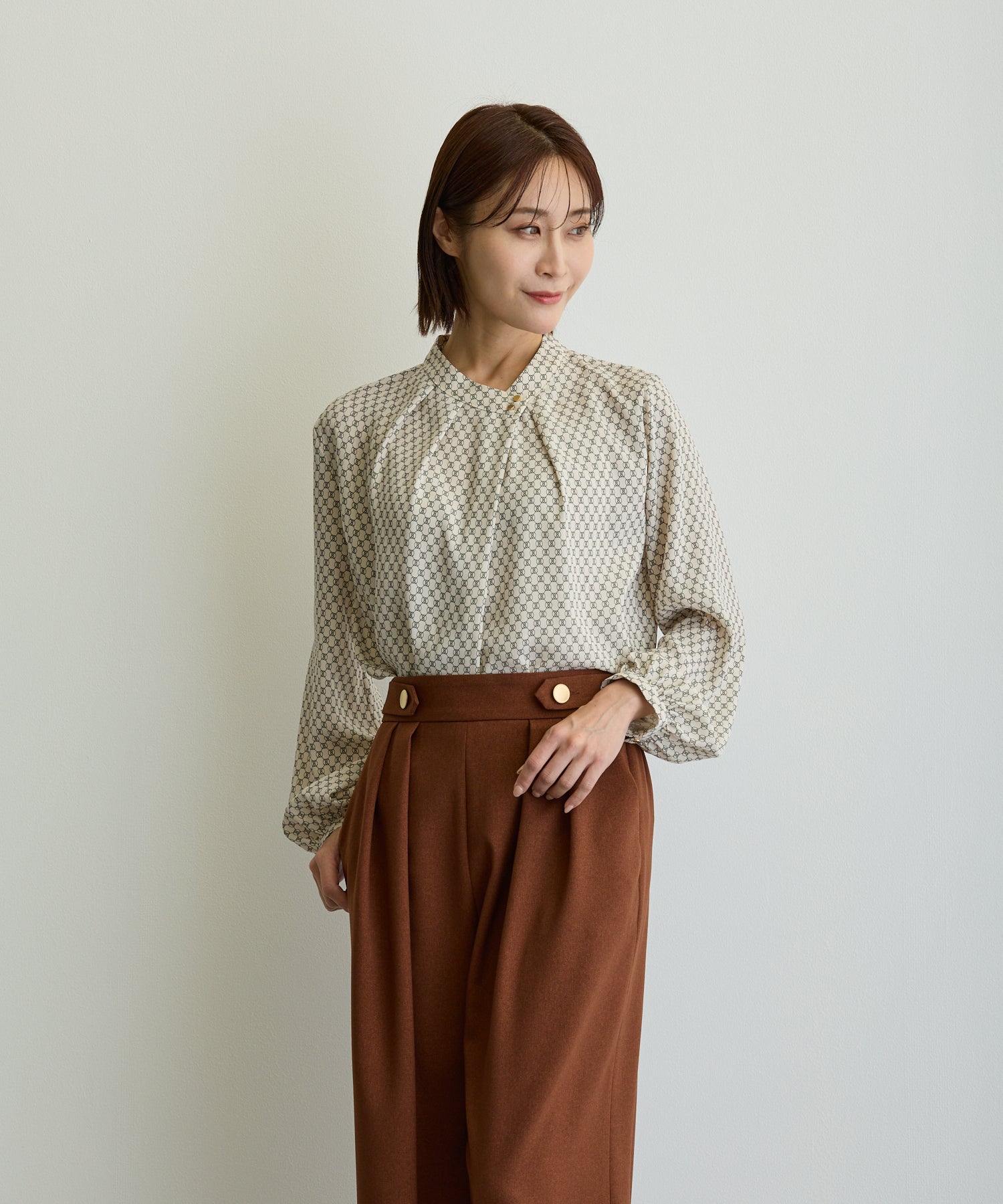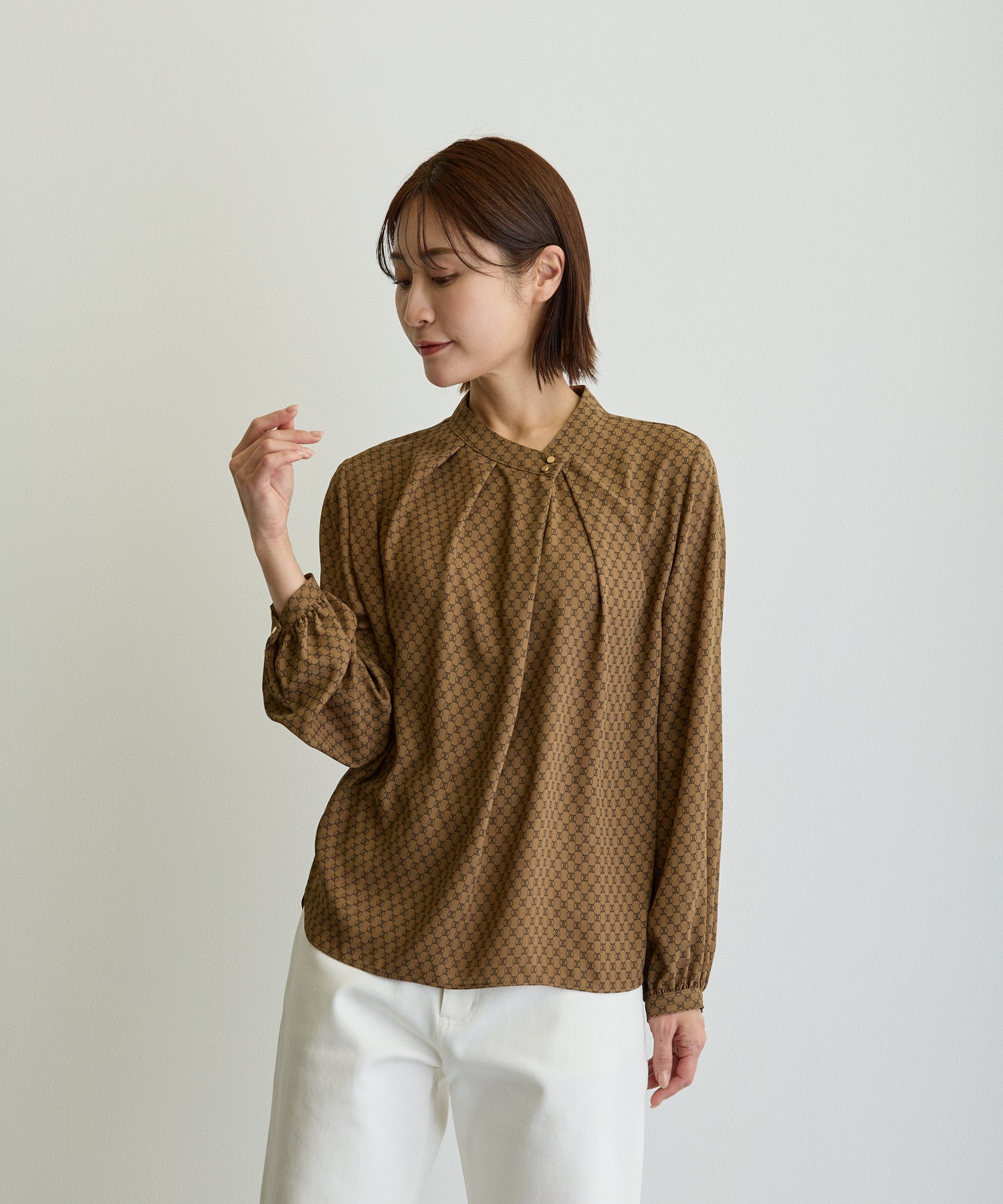 幾何柄メタル釦アシメタックブラウス/ブラウン系【日本製】