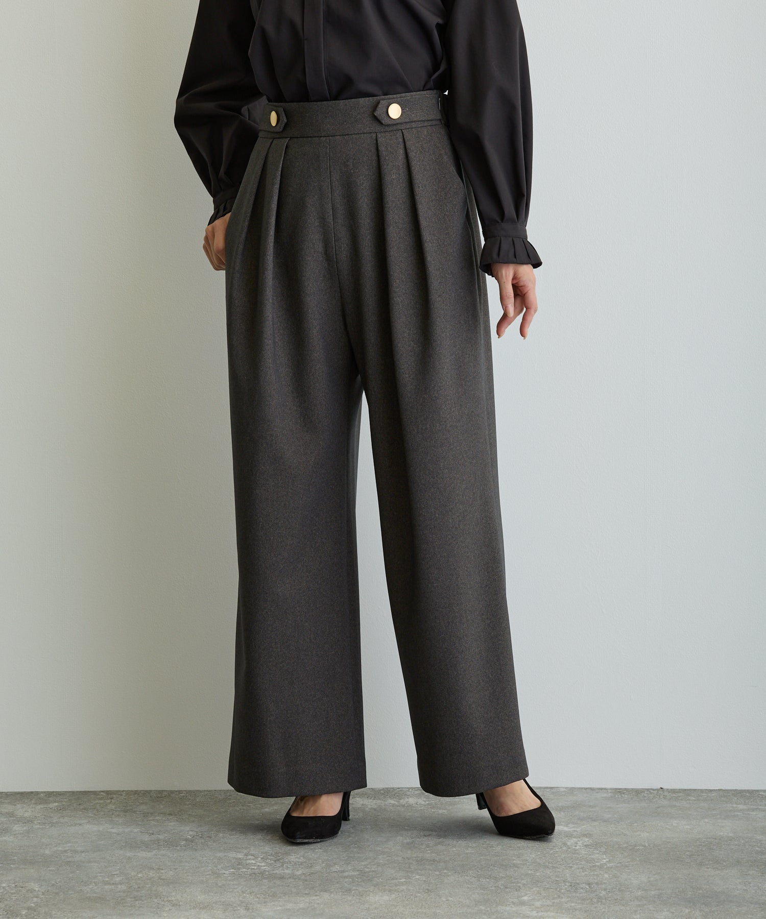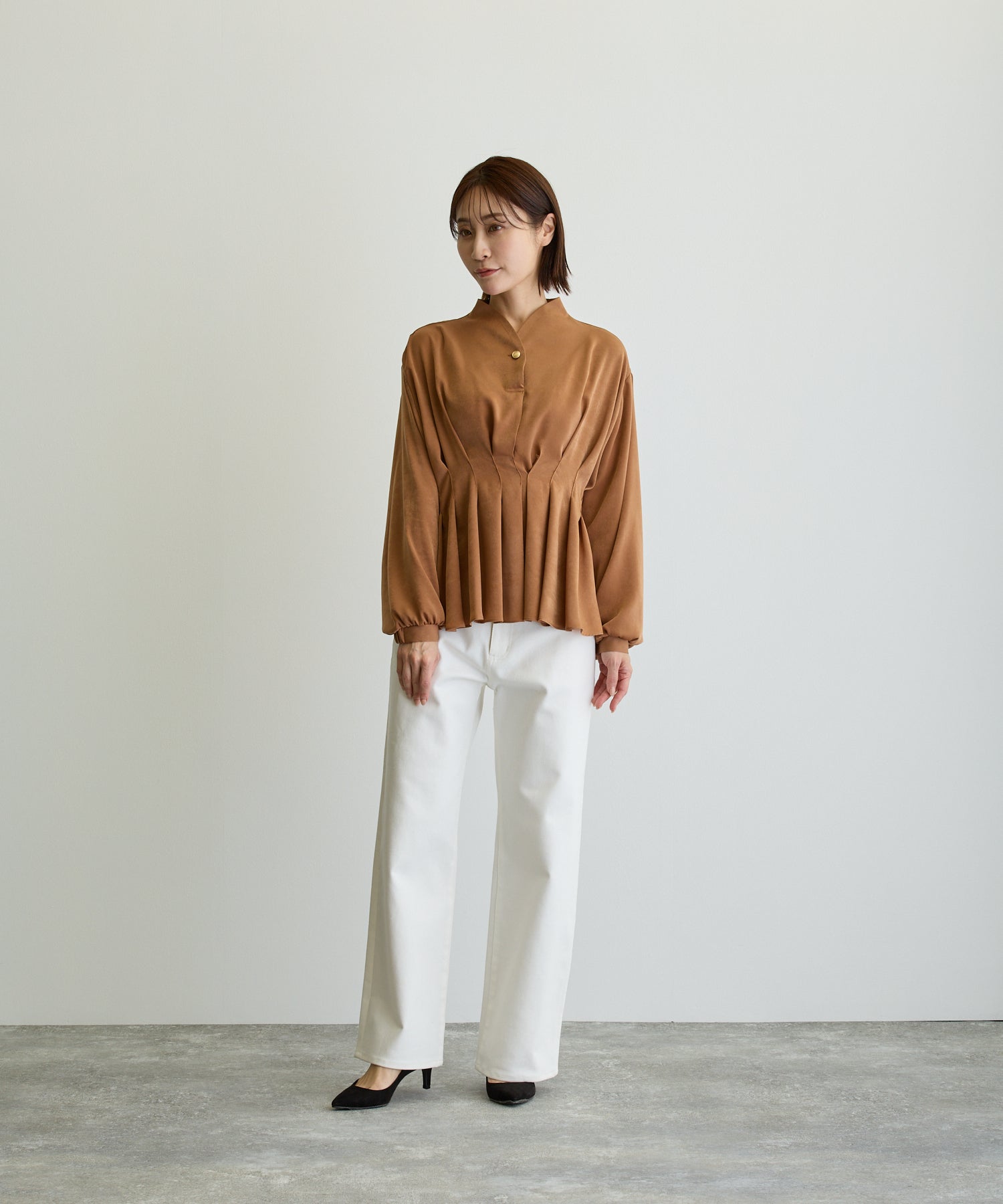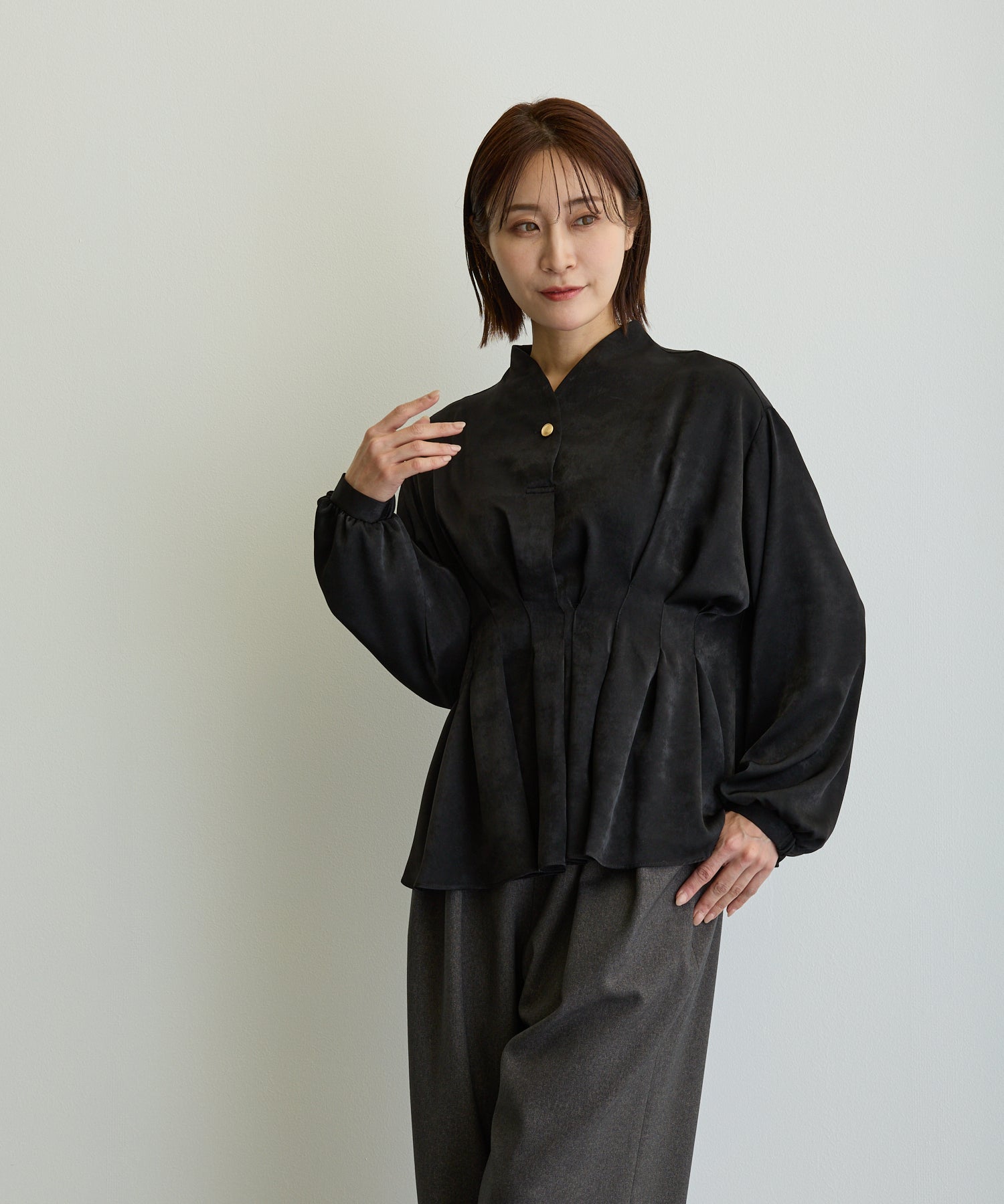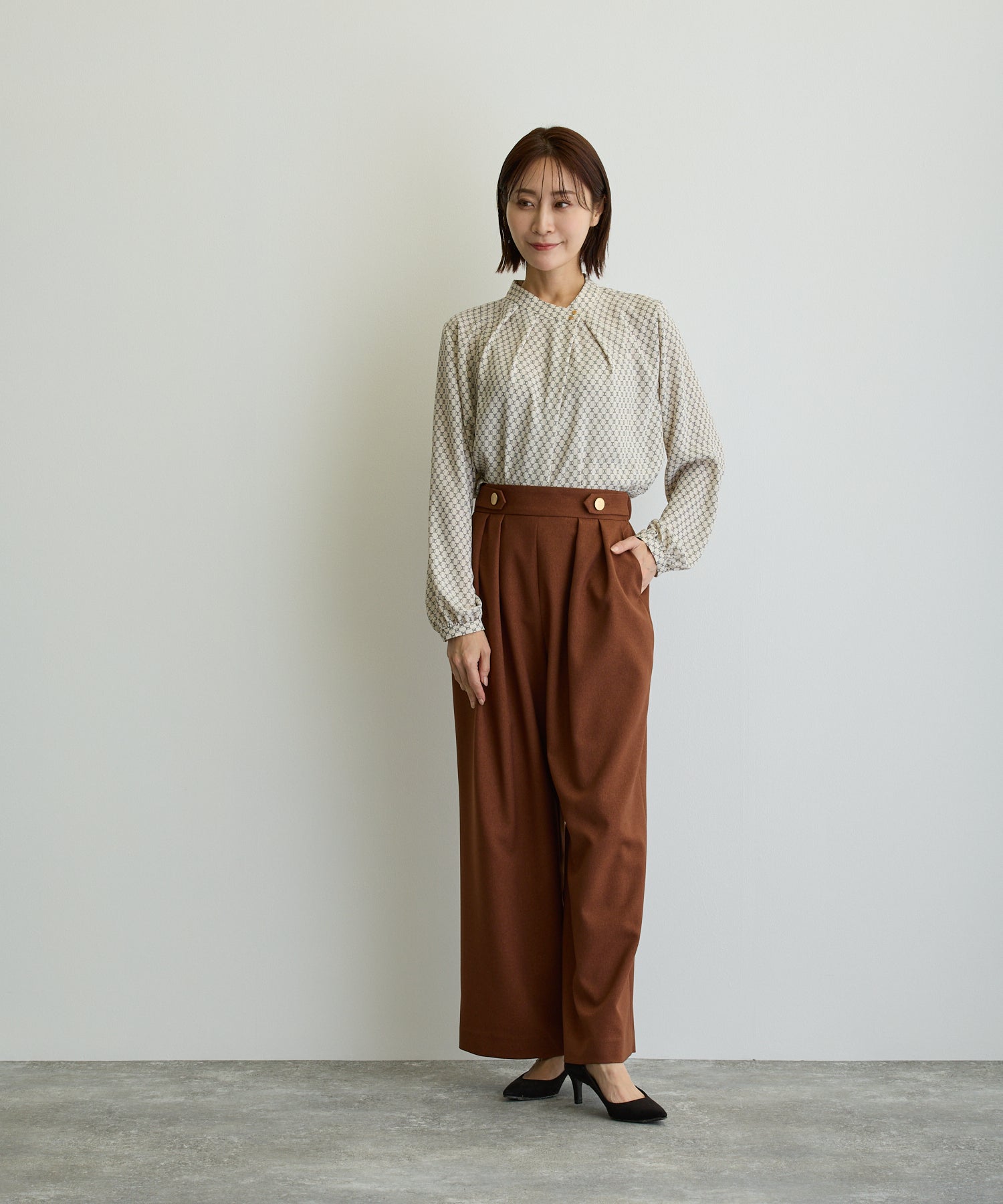 幾何柄メタル釦アシメタックブラウス/ブラウン系【日本製】