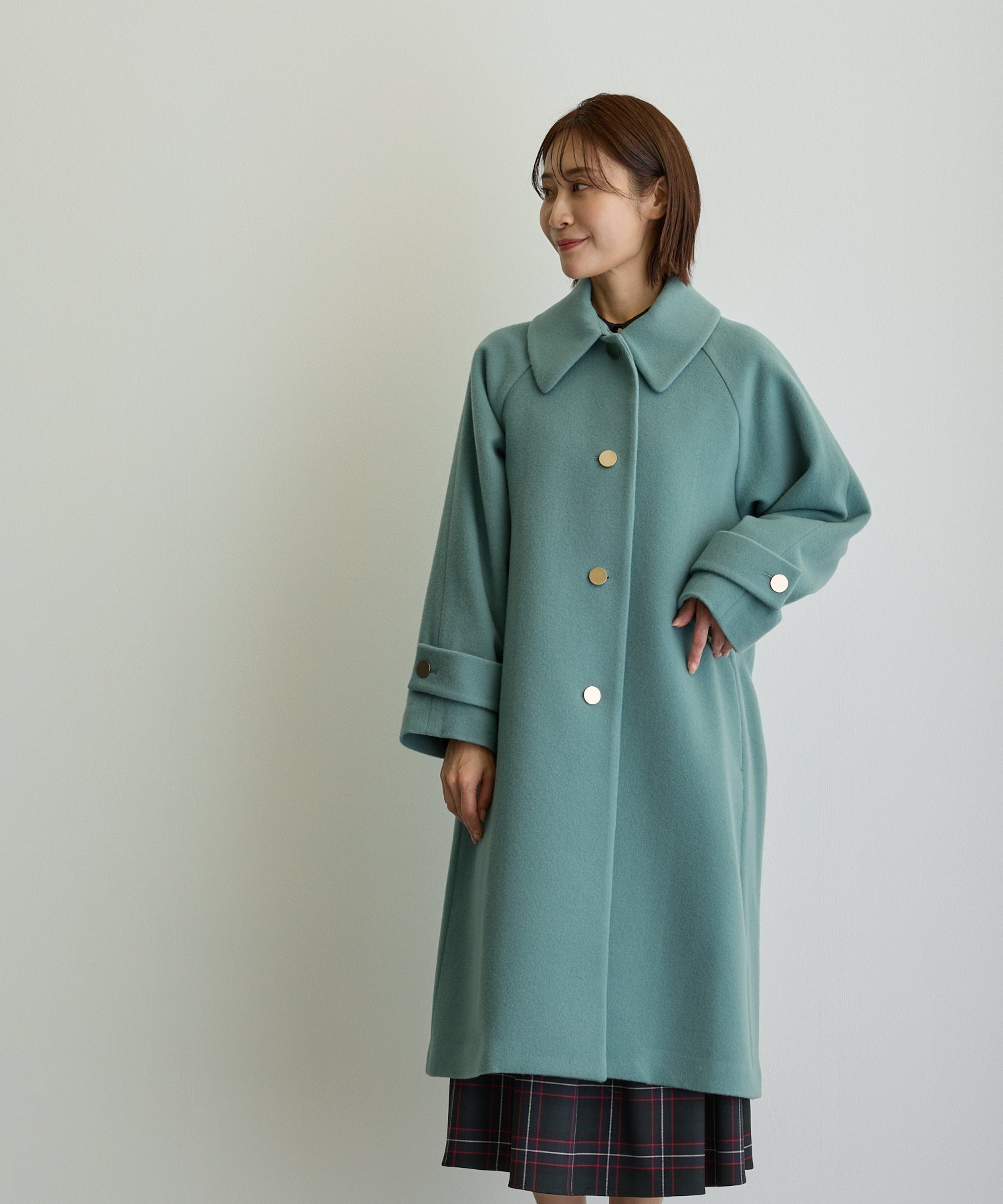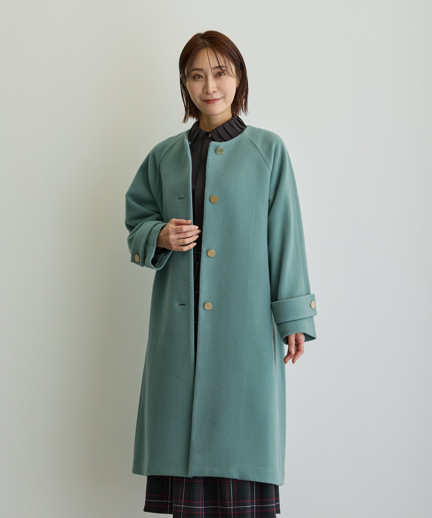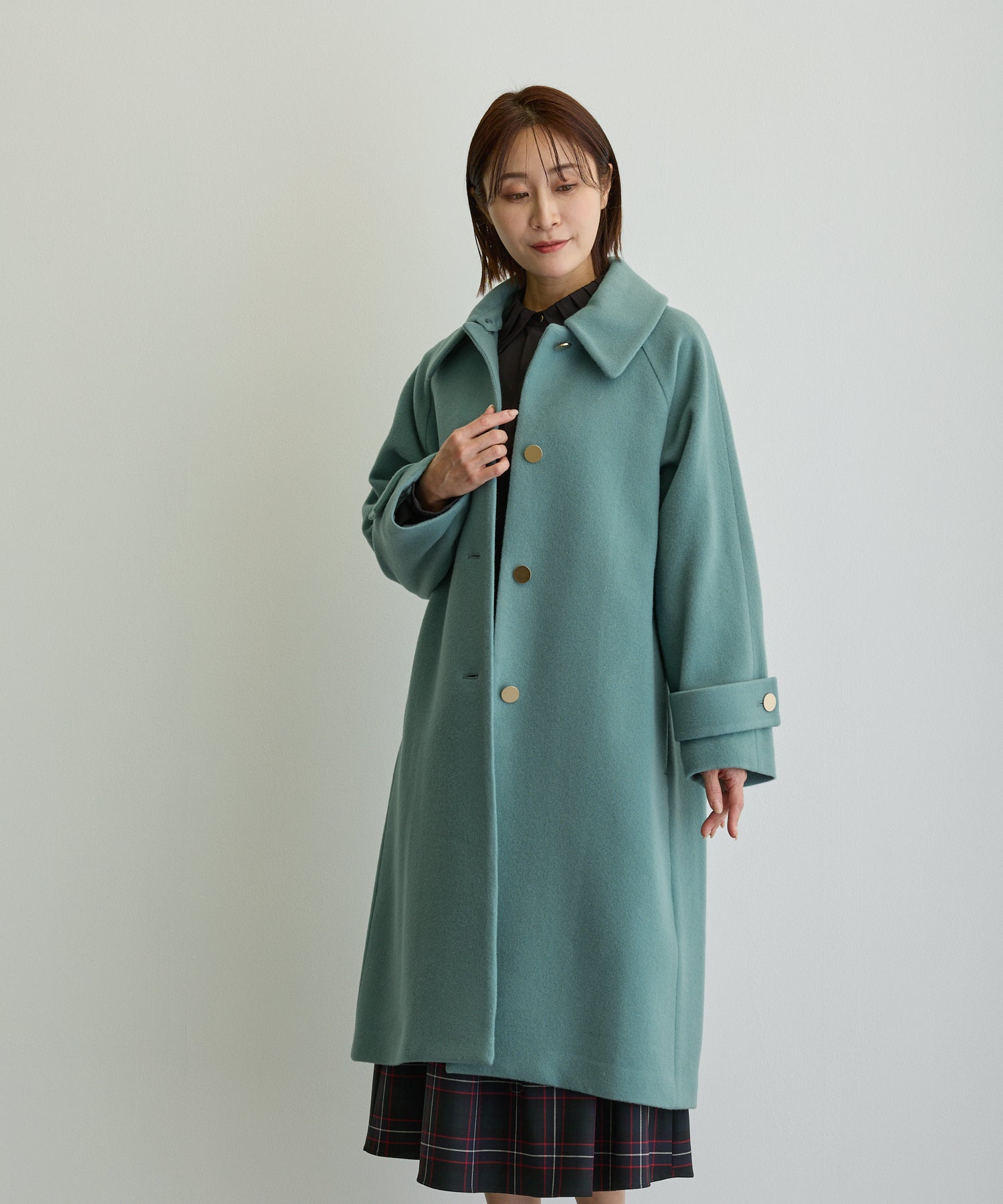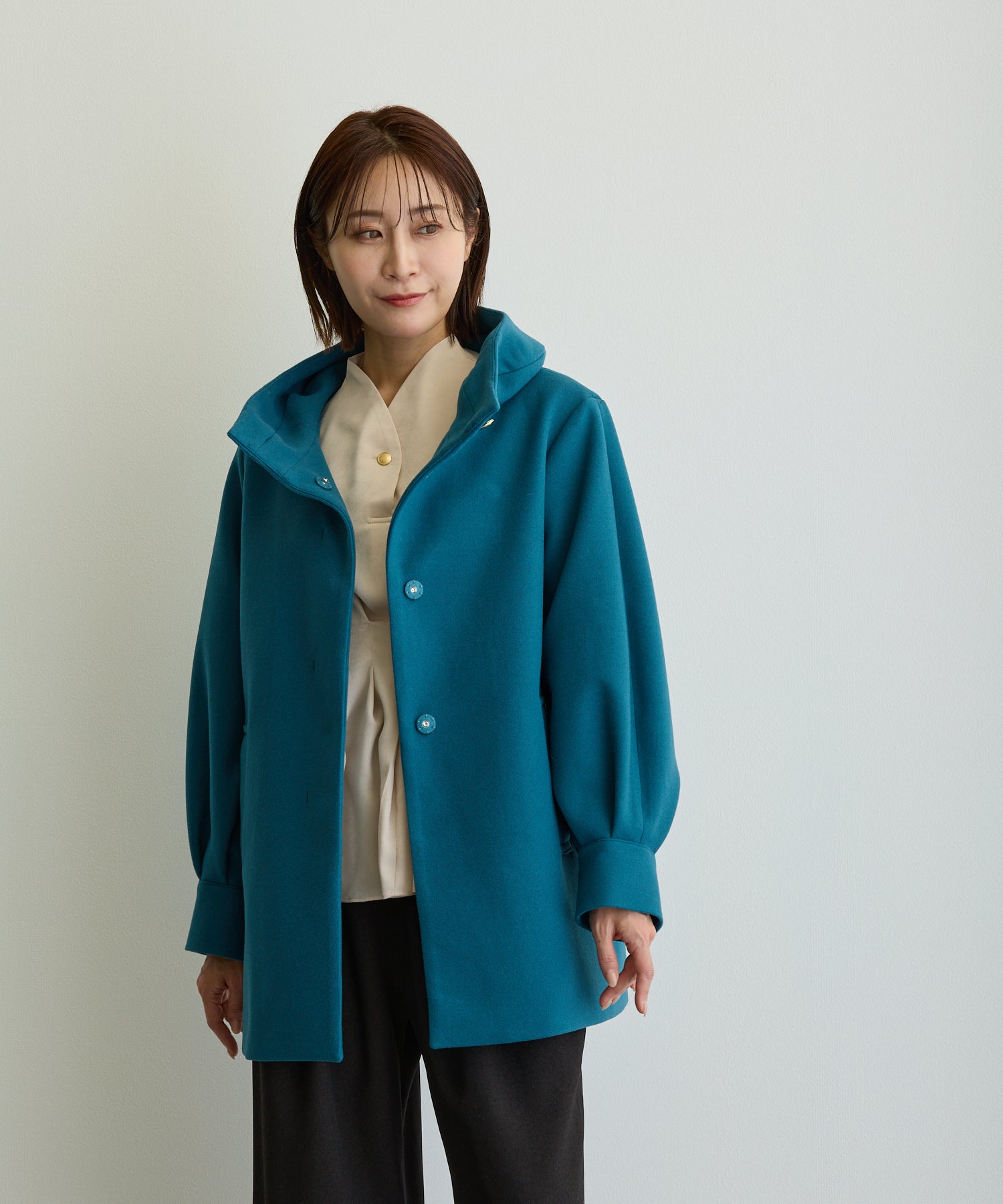 デザイン立体スタンドカラーミドルコート/ブルーグリーン【日本製】