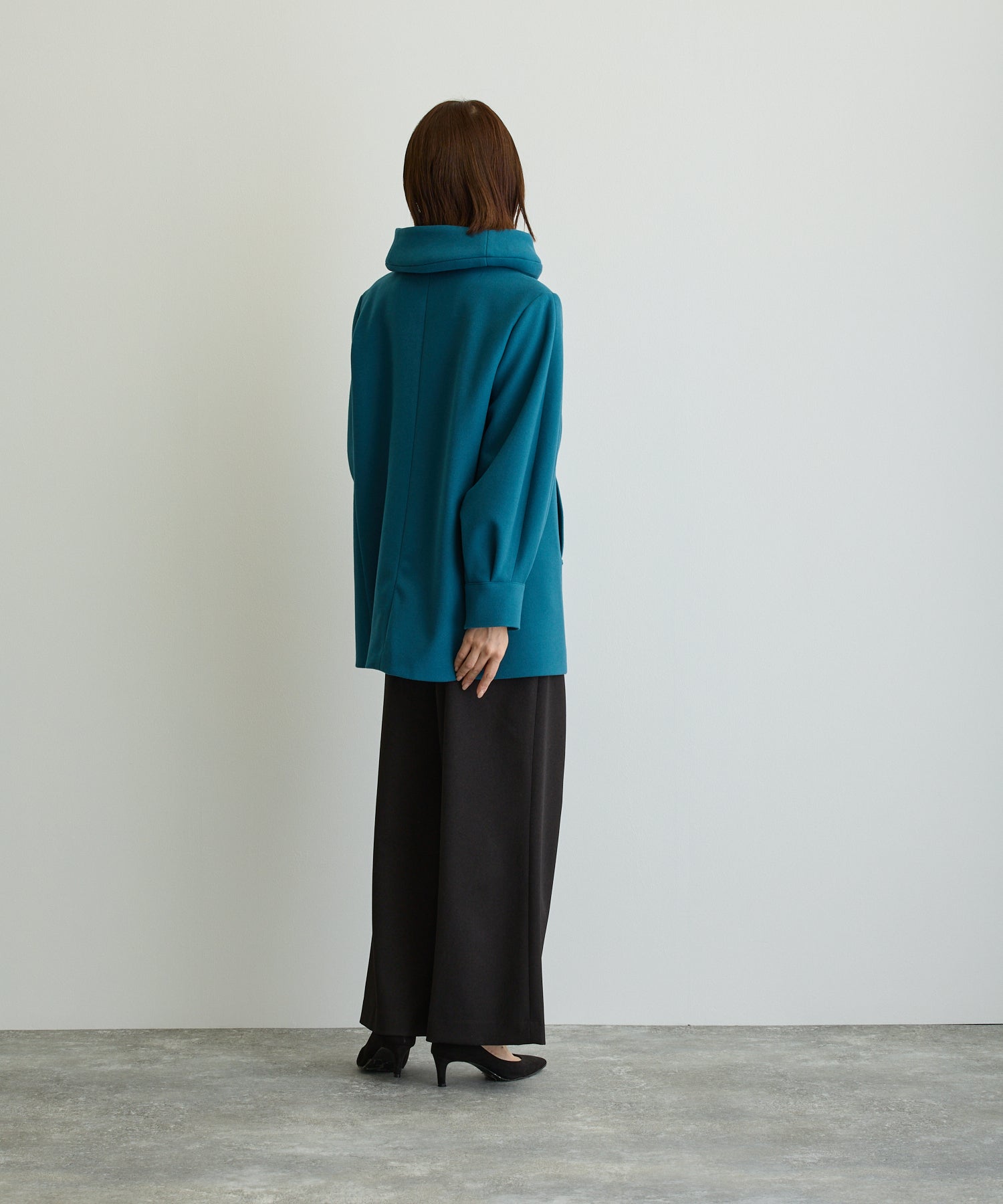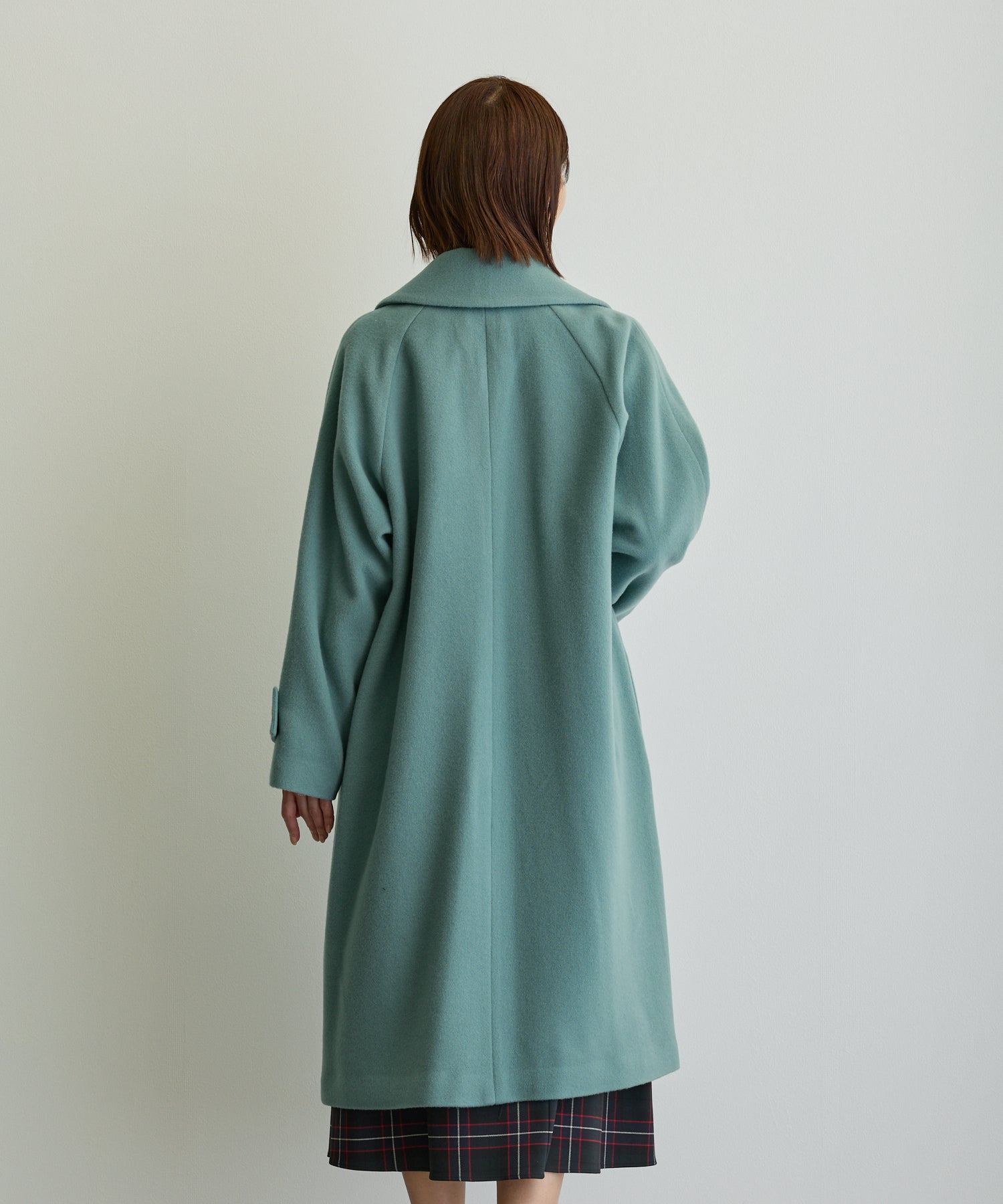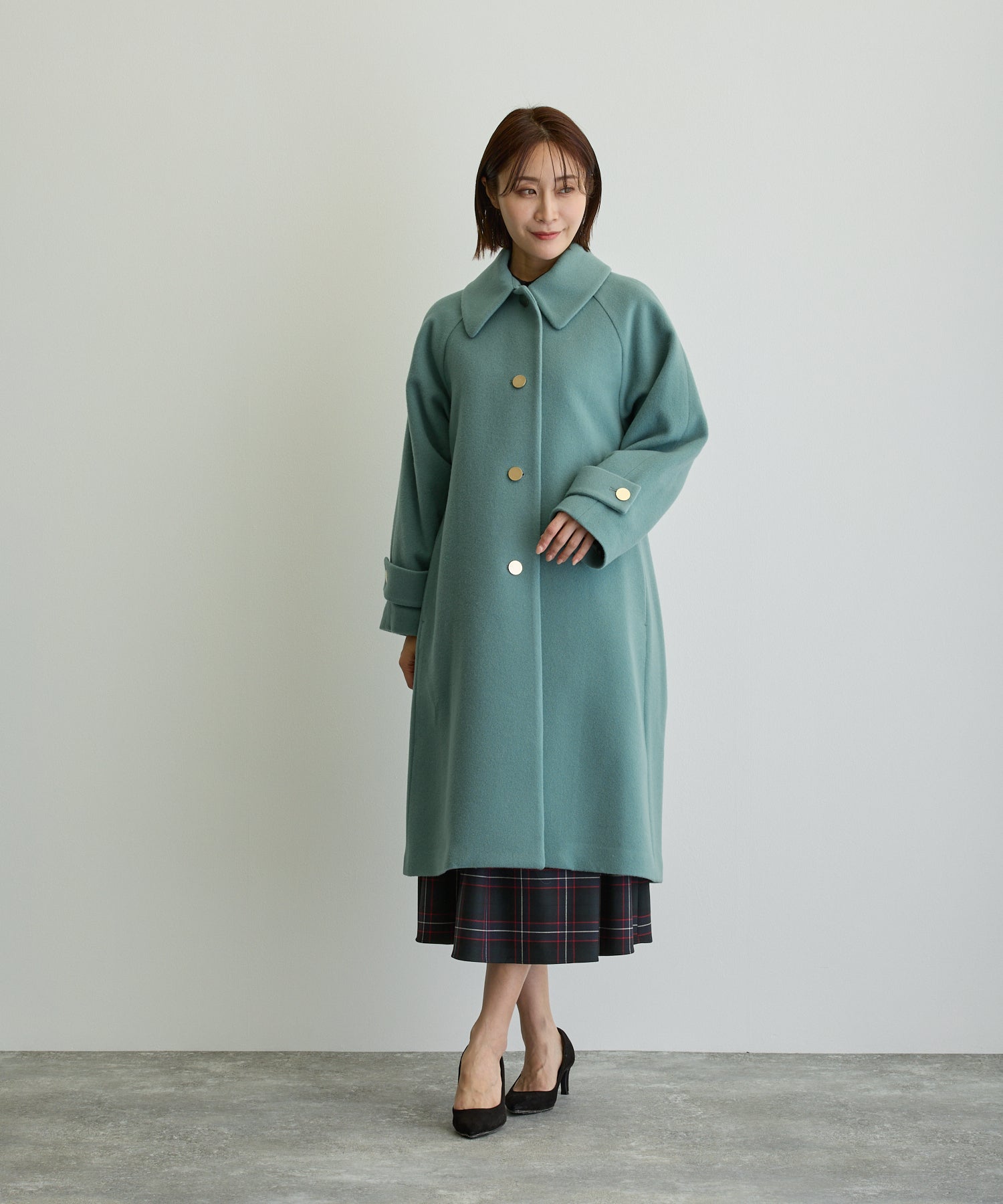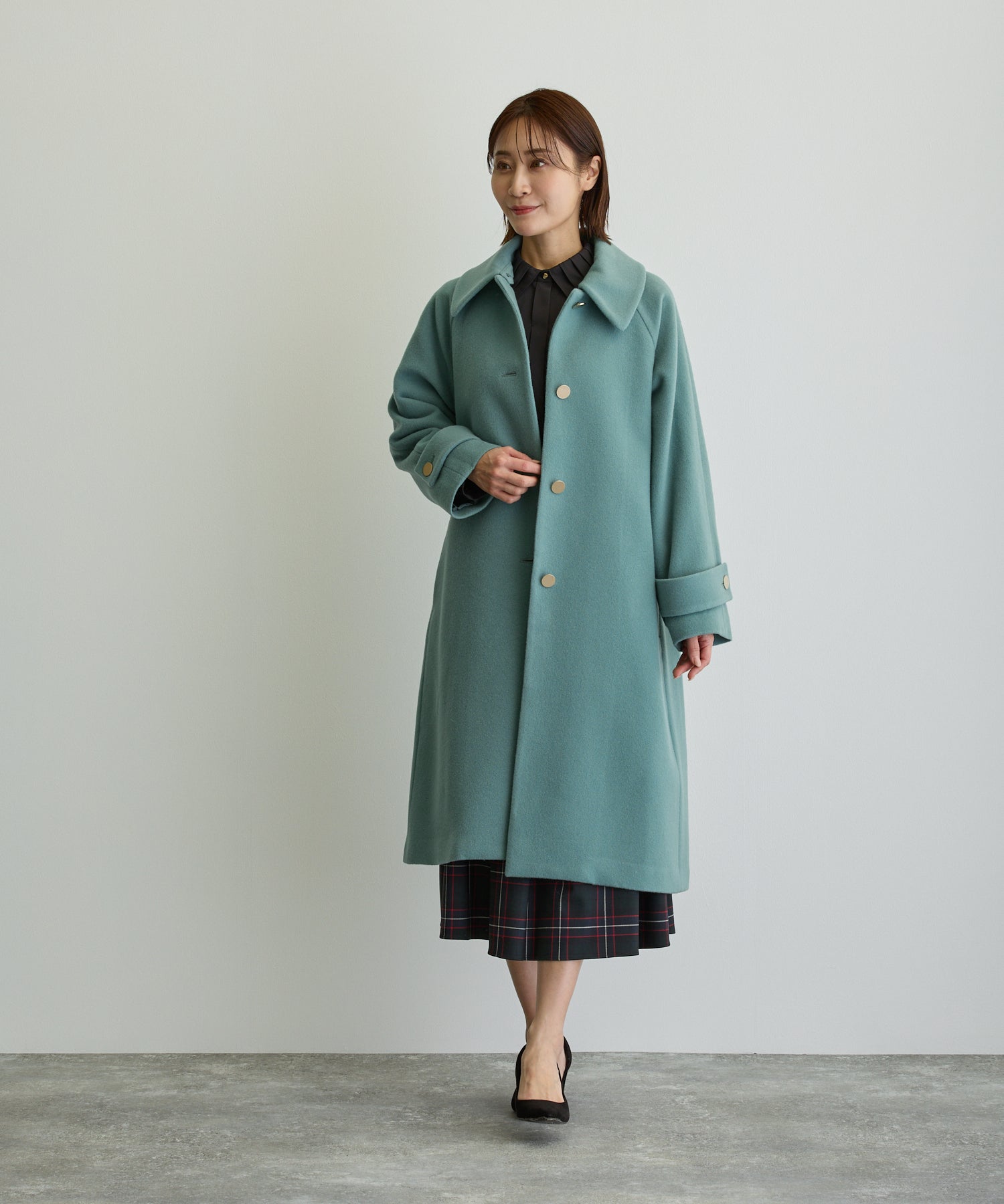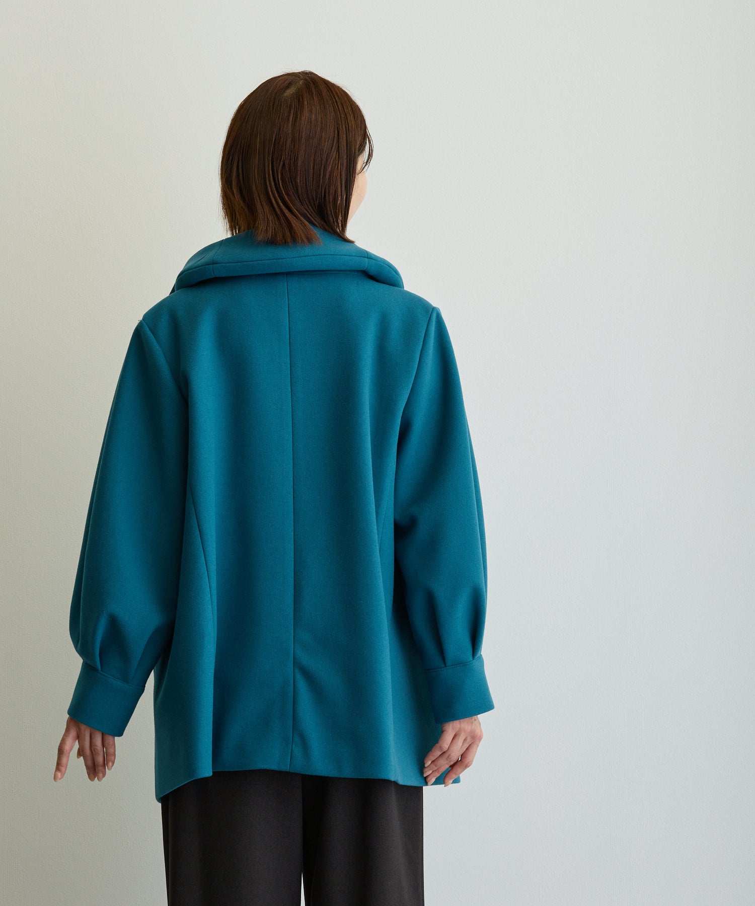 デザイン立体スタンドカラーミドルコート/ブルーグリーン【日本製】