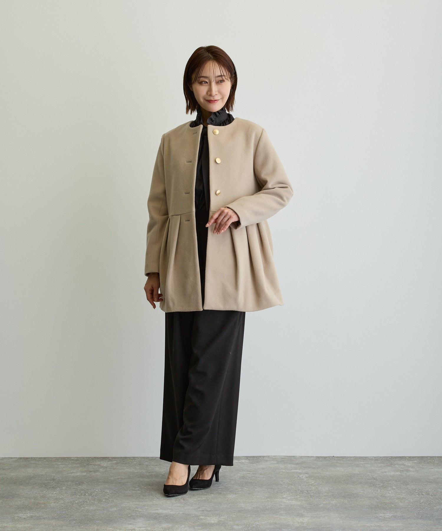 ペプラムノーカラーコート/ベージュ【日本製】