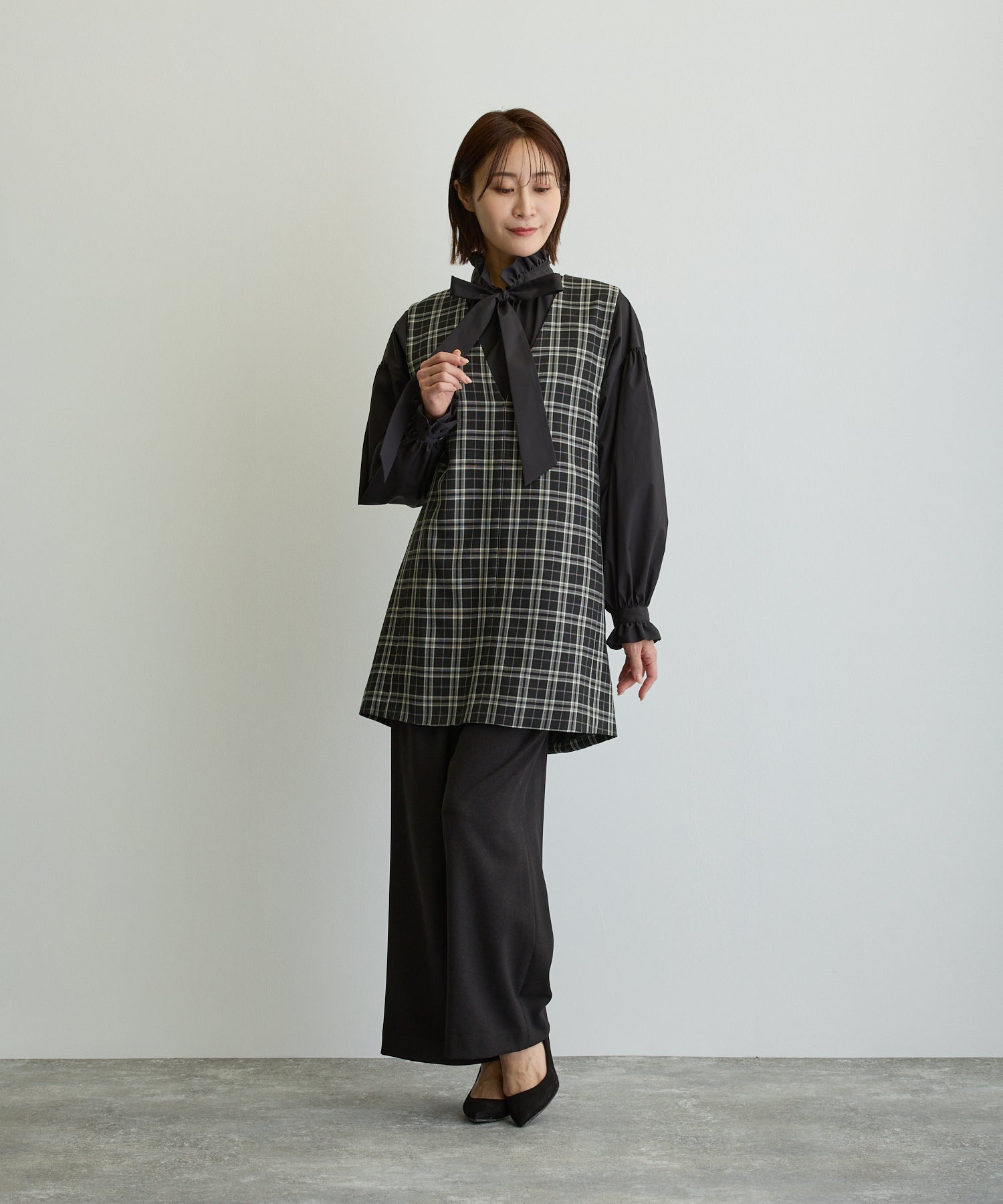 Vネックチェックミニワンピース/ブラック×オフ【日本製】