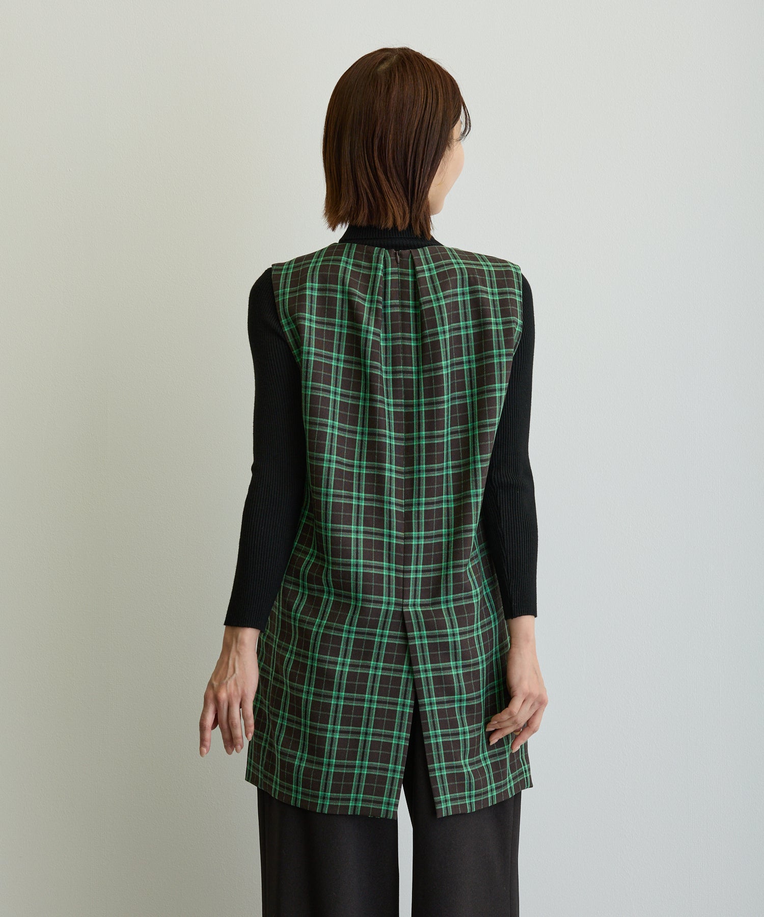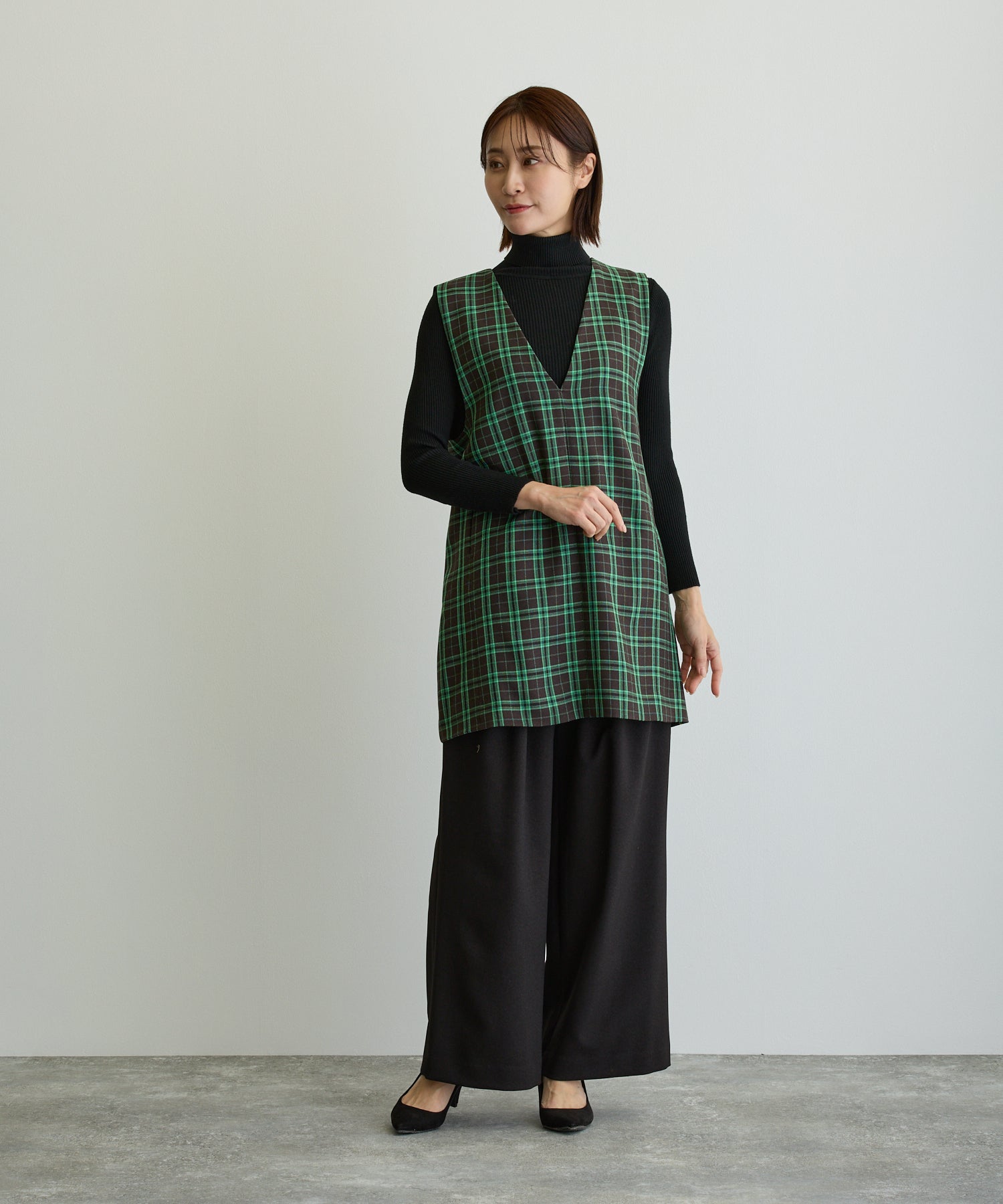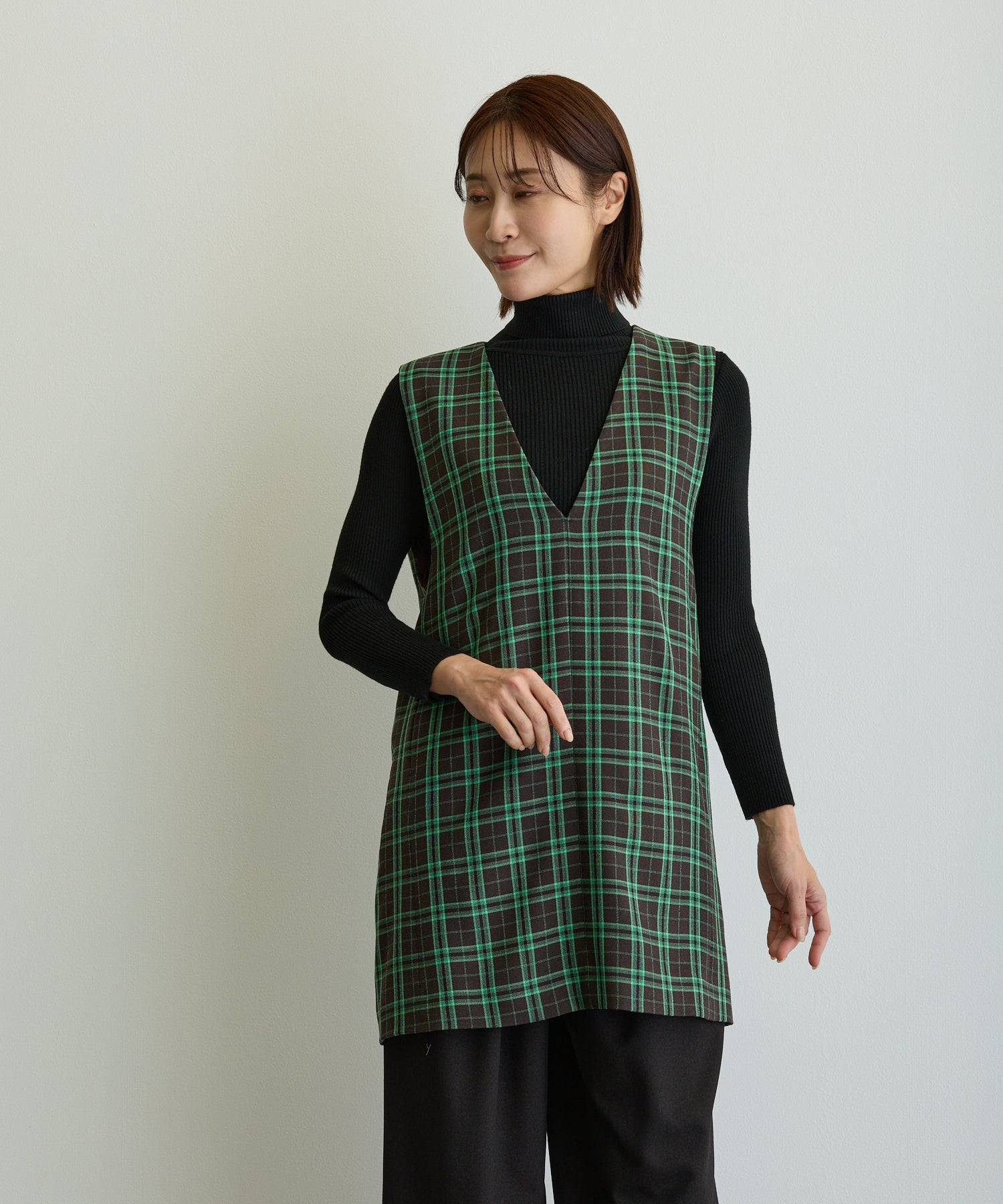 Vネックチェックミニワンピース/ブラウン×グリーン【日本製】